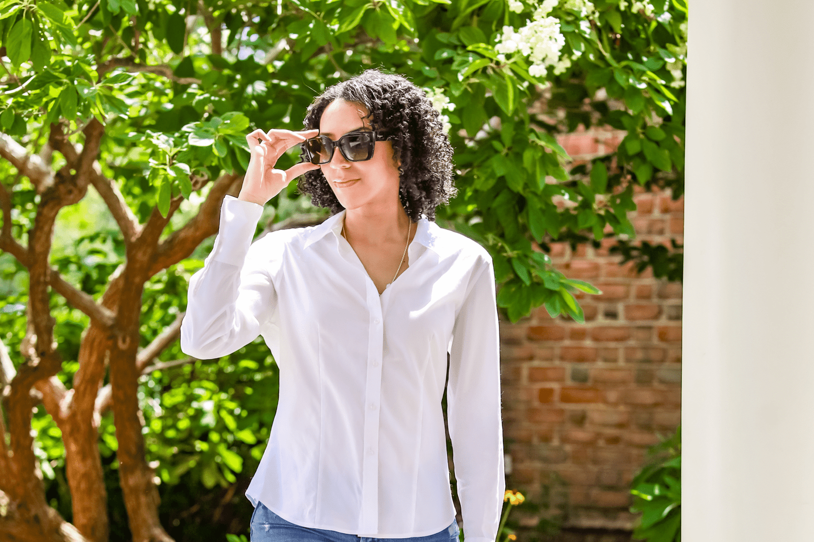 For this preppy look, I styled denim jeans with a white linen button-down shirt, a teal Kate Spade bag, and crocodile leather loafers. Even though I wasn’t near a body of water, I still decided to wear Sailing Day by Replica for today’s scent. Summer is also the season to ditch the flat irons and show off the curls.