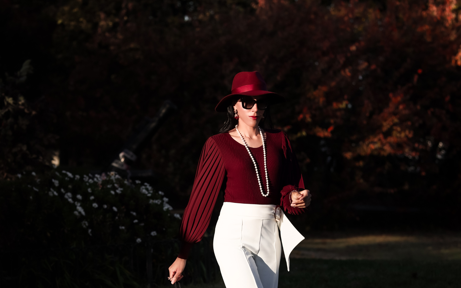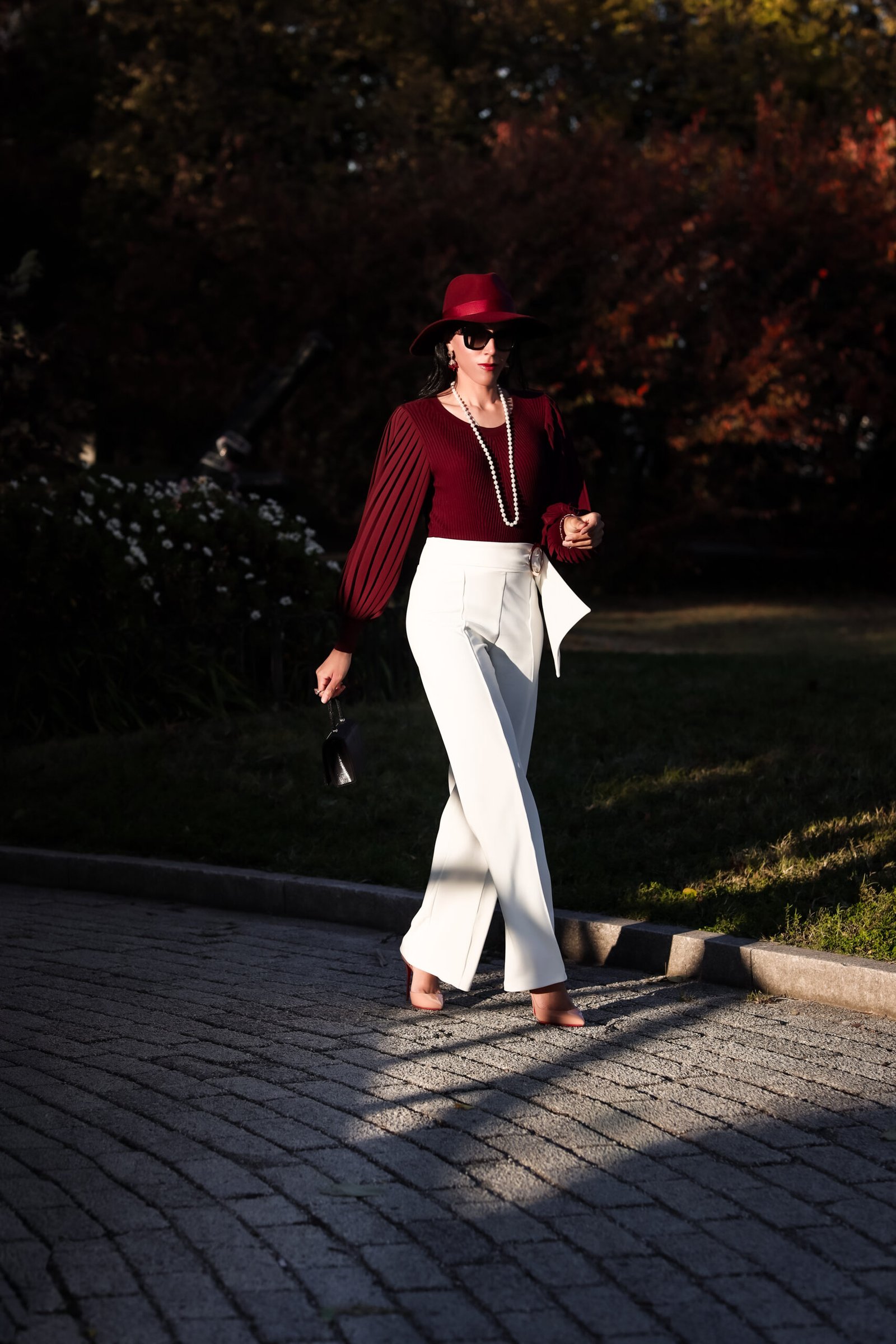 This outfit revolved around Bordeaux, featuring a deep wine blouse with pleated sleeves with a matching wool hat. To offset the depth and mystery, I chose cream high-waisted tailored pants to elongate my silhouette.