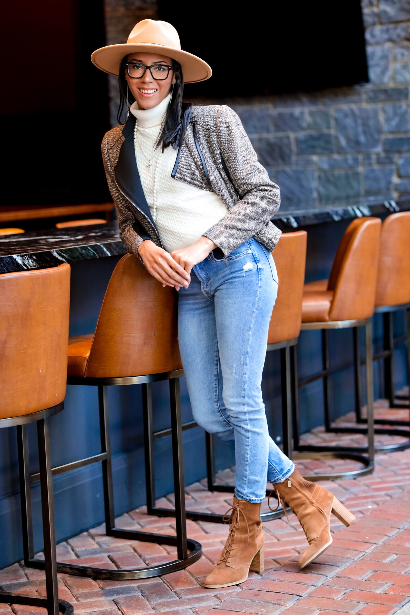 I styled the tweed jacket with an ivory knitted sweater from Alexia Admor that adds warmth and softness.A pair of mid-rise jeans provides a subtle contrast to the earthy tones and keeps the outfit casual yet refined.